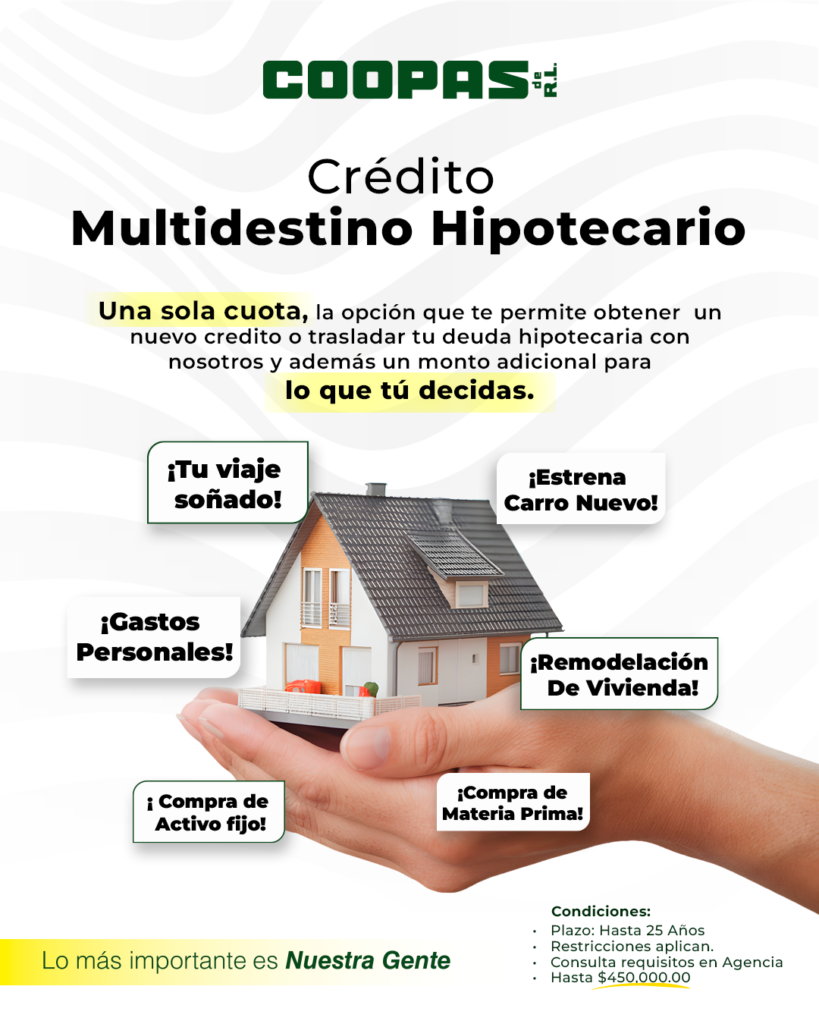 Dirigida a asociados, empleados públicos y privados, pensionados, profesionales independientes y empresarios que buscan un financiamiento seguro, respaldado con garantía hipotecaria.